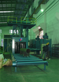 我公司設(shè)計(jì)制造的通過式拋丸機(jī)已調(diào)試完成,通過驗(yàn)收投入使用;它能夠?qū)μ幱谠紶顟B(tài)的鋼材表面施以強(qiáng)烈拋丸,清除其銹斑和焊渣及氧化層;